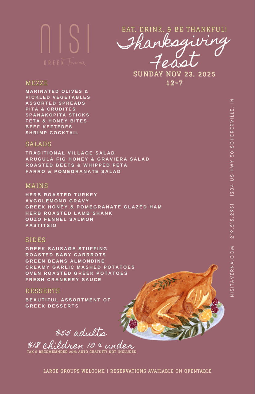 Celebrate Thanksgiving the Mediterranean way at Nisi Greek Taverna! Join us on Sunday, November 23rd, 2025, from noon to 7 PM for a festive Thanksgiving Feast filled with Greek flavors, family-style hospitality, and seasonal favorites.